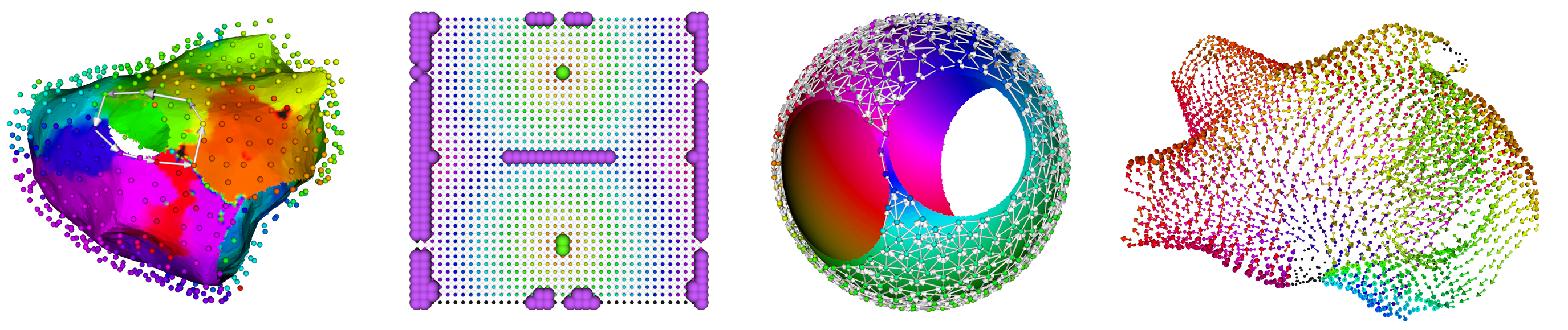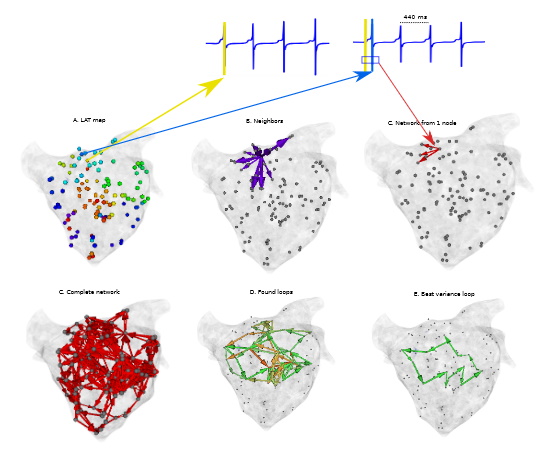 DGM takes as input measurements which have been gathered by the catheter. After the doctor has finished to map the inside of the atria, we can apply our tool (see Figure). The XYZ-coordinates of the electrodes and the Local Activation Time (LAT) (the times when the electrical waves passed in the heart) are loaded in the software. With this information, a directed graph is created. Then we apply special algorithms to find cycles in the network. Afterwards, additional filters are applied (which rates the loops based on how orthogonal they pass the wavefront, we call this phase variance). The software then visualises the rotational circuit or focal source of the arrhythmia, so the doctor can easily know where to ablate. DGM will be patented, and we hope one day to bring our software to the market. However, the are many opportunities to do additional research with this idea, and many our thesis subject are all related to the further development of DGM.