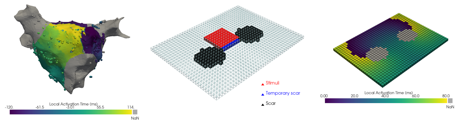 Summary · Currently, many methods we develop to diagnose atrial tachycardia show promising results for simulated data, but fail to do so on clinical data. We believe the main issue is the absence of lines of functional or scar-related conduction block in our simulations. These areas lead to incorrect estimation of the physiological wavefront propagation, causing our algorithms to produce erroneous detections. Conduction block is defined as a region where excitation waves cannot travel through. It can be functional in nature, meaning the refractory period of some wave is responsible for the block of another wave. The other type is scar-related, where the conduction block is related to scarring of the cardiac tissue.