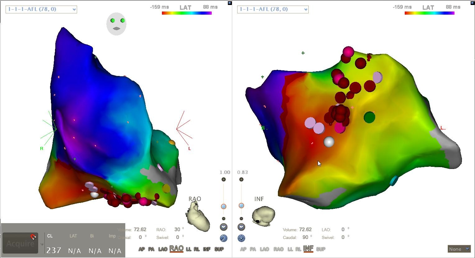 For this, the electrophysiologist (medical doctor) inserts a catheter (measuring electrodes) in the heart and records the electrical activity in the heart. As a result, the medical doctors can obtain a color coded map, as presented in the Figure \ref{map}. In case a clear reentry is detected in the heart, the EP will create a scar which interrupts the reentry path. In case a focal source is detected, this location will be ablated so the focal source can no longer emit electrical activity. It can be very challenging to precisely determine the mechanism of an arrhythmia in a patient. Moreover, wrong ablation lines can make the heart even more prone to new arrhythmia, while also limiting the contractility of the heart. Unfortunately, in the clinical practice there still exist no good automatic algorithms to determine the location of cardiac arrhythmia. This is exactly the problem which we tackle in our research group.