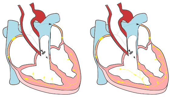 The heart consists of 4 parts: 2 upper chambers, called the atria, and two lower chambers, the ventricles. The contraction of the heart is initiated by an electrical wave which automatically starts at the sinoatrial nodein the right atrium. From there, the electrical wave spreads through the whole right and left atrium. The electrical signal is then delayed at the AV node, before it spreads rapidly through the bundle of his and excites both ventricles. As the electrical wave initiates contraction, the atria contract first, pumping the blood into the ventricles, after which the ventricles contract, pumping the blood into the lungs and the whole body.